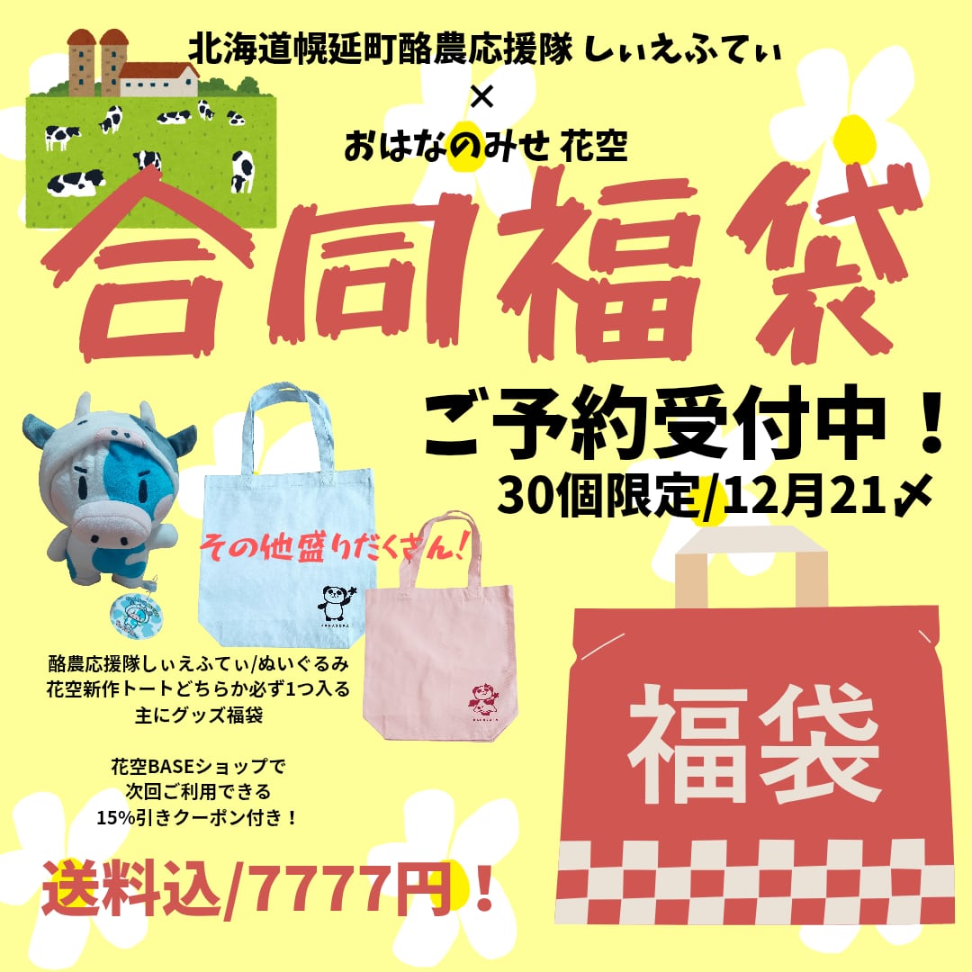 新たに「次回使える!花空15%割引クーポン付き福袋」が仲間入りしました!こちらの福袋には、北海道幌延町酪農応援隊との合同企画で、さまざまな牛ちゃんのグッズや弊社キャラクターそらくんのグッズや花グッズが詰まっています。お得な割引クーポンもついているので、次回のお買い物がさらにお得になりますよ!