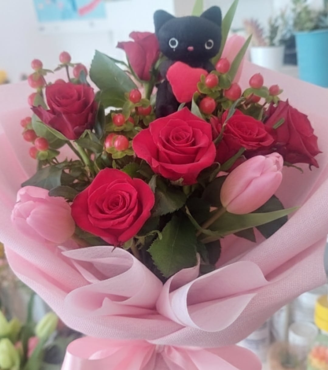 自宅や職場でのデコレーションとしても楽しめる「ネコちゃん付き!大好きブーケ!」をぜひあなたに取り入れて、愛情を込めた瞬間をお楽しみください!