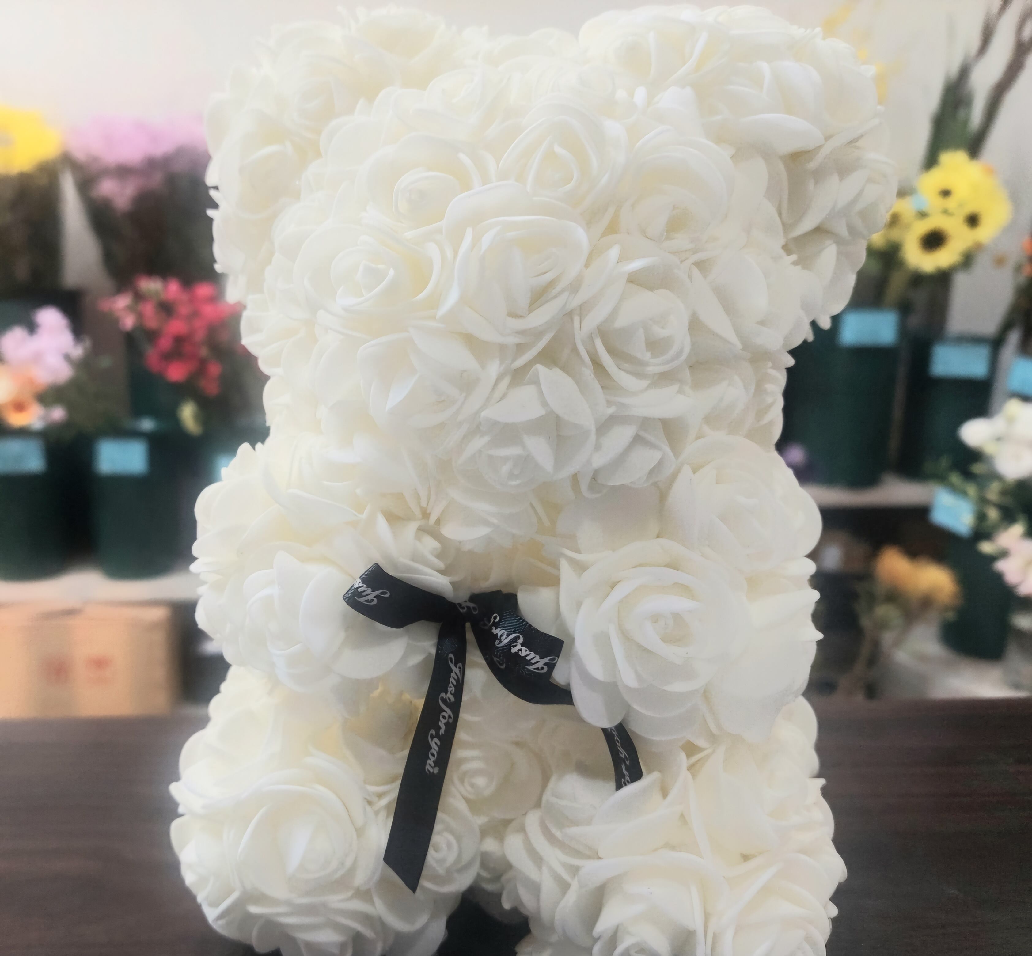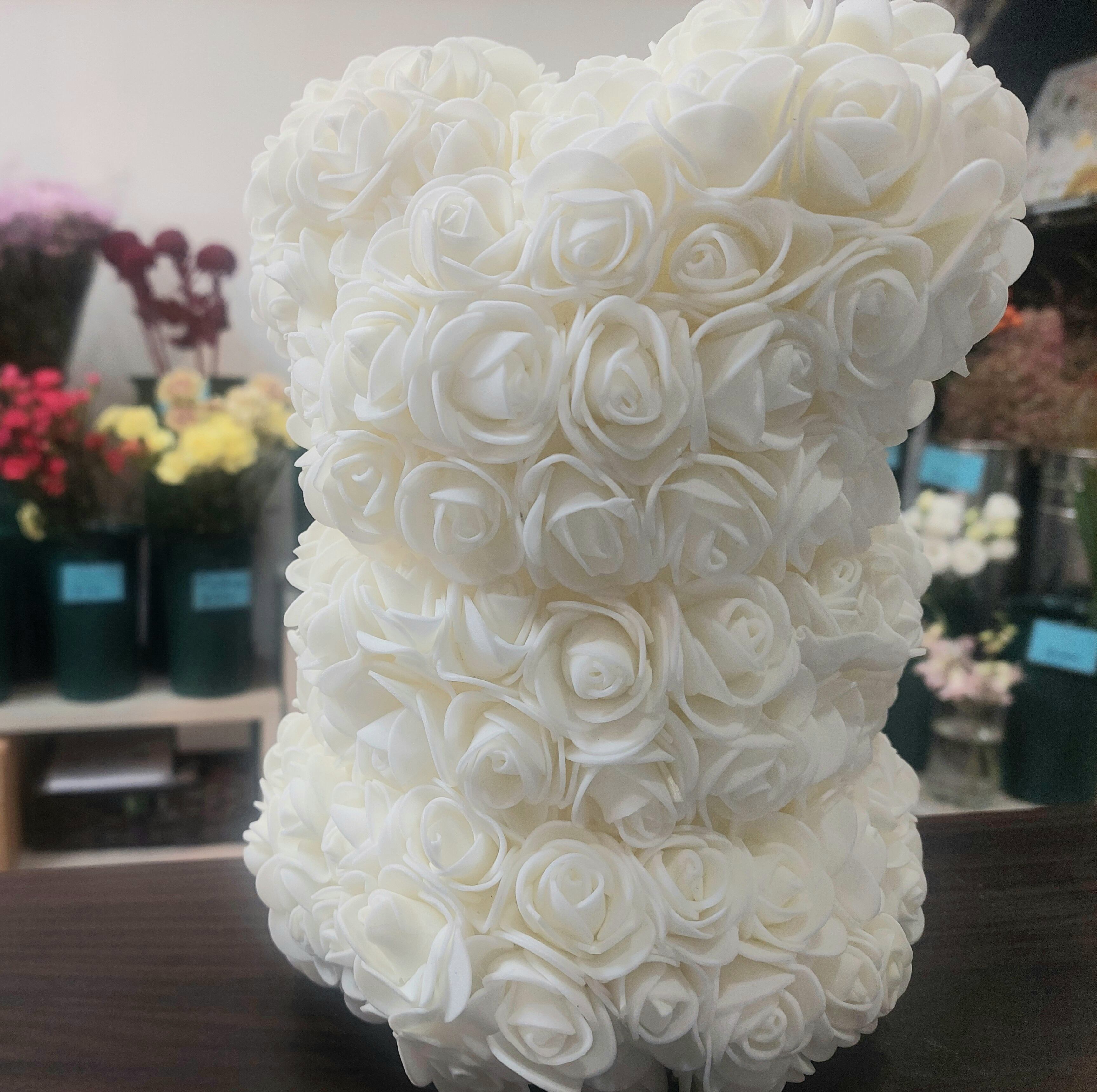 疑似的な花を愛でられる、おはなくまちゃん。優しいピンクや紫色が混ざった色調が、どこか懐かしくて可愛らしい雰囲気を演出します。お部屋のインテリアに飾ったり、贈り物としても喜ばれること間違いなし!造花なので、枯れる心配もなく、ずっと可愛さを楽しむことができます。ほっこりとした空間作りにおすすめの一品です。